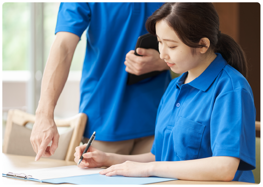 訪問鍼灸をスタートさせる前に、実践トレーニングとして先輩の訪問鍼灸に同⾏しながら流れや患者様のやりとりを実践的に学んでいきます。⼀⼈で訪問鍼灸に伺う前に、現場で聞いておきたいことを⼀つひとつ丁寧に先輩社員に確認し、指導をうけることができます。